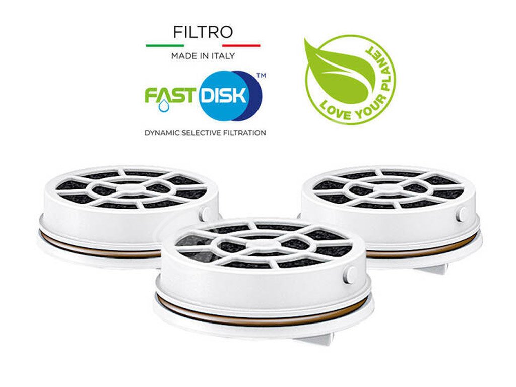 Instantná filtrácia kedykoľvek a kdekoľvek. Inovatívny uhlíkový filter FAST DISK redukuje chlór aj nežiaduci zápach a zlepšuje chuť vody vo vašej filtračnej fľaši alebo karafe.