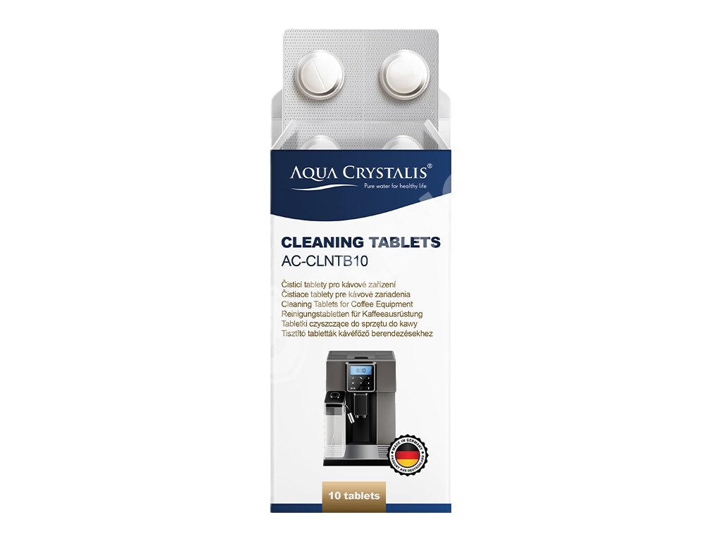 - 1× Aqua Crystalis AC-CLNTB10 (10×2g) – čistiace tablety na odstránenie mastnoty a kávových olejov z vnútorných častí prístroja. Vhodné pre automatické a poloautomatické kávovary.